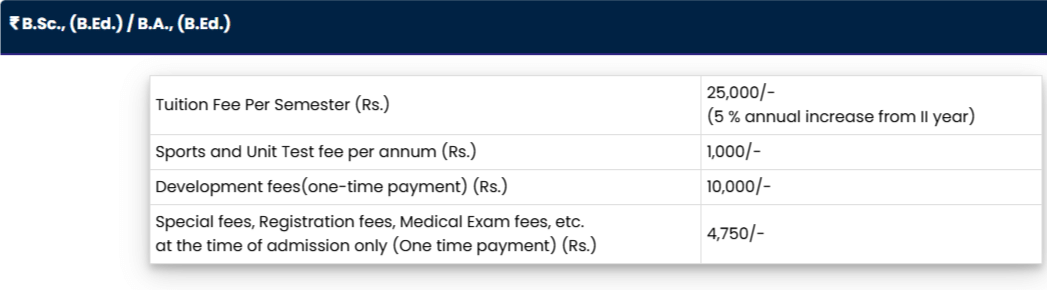 Earlier, BA + B.Ed fees at SASTRA was ₹ 2.18 Lakhs (in 2024) for the entire course duration. This shows a fee increase of ₹ 1,000 over the year.