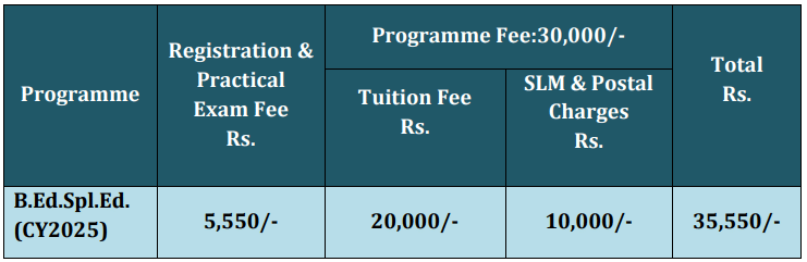 TNOU B.Ed Special Education [Learning Disability] is offered as 2 Years 6 Months Part Time program. The minimum eligibility criteria for B.Ed is 10+2. The total fees for TNOU B.Ed Special Education [Learning Disability] in 2025 is ₹ 35,550 for the complete course duration.