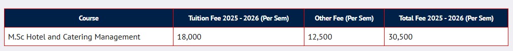 Earlier, M.Sc Hotel & Catering Management fees at VISTAS Chennai was ₹ 1.12 Lakhs (in 2024) for the entire course duration. This shows a fee increase of ₹ 10,000 over the year.