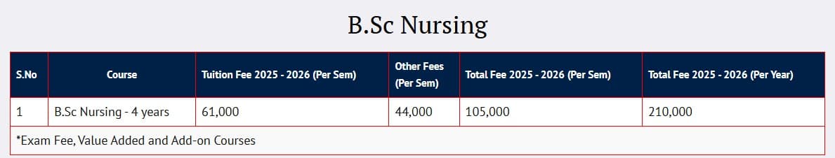 Earlier, B.Sc (Nursing) Nursing fees at VISTAS Chennai was ₹ 7.96 Lakhs (in 2024) for the entire course duration. This shows a fee increase of ₹ 44,000 over the year.