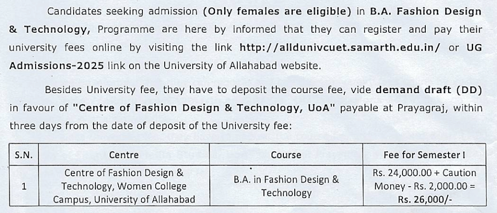 The minimum eligibility for admission to BA Fashion Design and Technology at Allahabad University is 10+2. Candidates are allotted seats based on CUET.