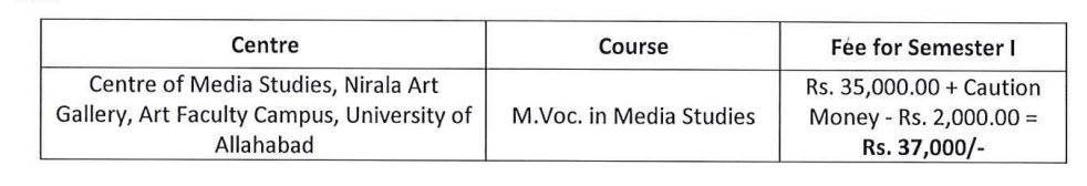 Allahabad University M.Voc Media Studies fees in first year is ₹ 72,000. The detailed fees is mentioned below.