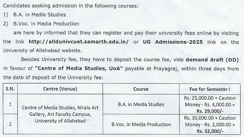 The minimum eligibility for admission to B.Voc Media Production at Allahabad University is 10+2 with 50%. Candidates are allotted seats based on CUET.