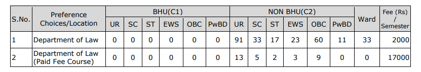 Banaras Hindu University (BHU) in Uttar Pradesh offers an LLB program recognized for its affordability and quality. The annual course fee is INR 3,000, with free books, medical aid, and on-campus transportation included. For regular students, the semester fee is INR 3,000. Paid seat students incur an additional INR 20,000 per semester, while international students pay an extra INR 30,000 annually. Hostel fees are INR 10,000 per year. The university's faculty-to-student ratio for LLB courses is 1:10, with over 30 professors for 300 students, ensuring personalized attention.