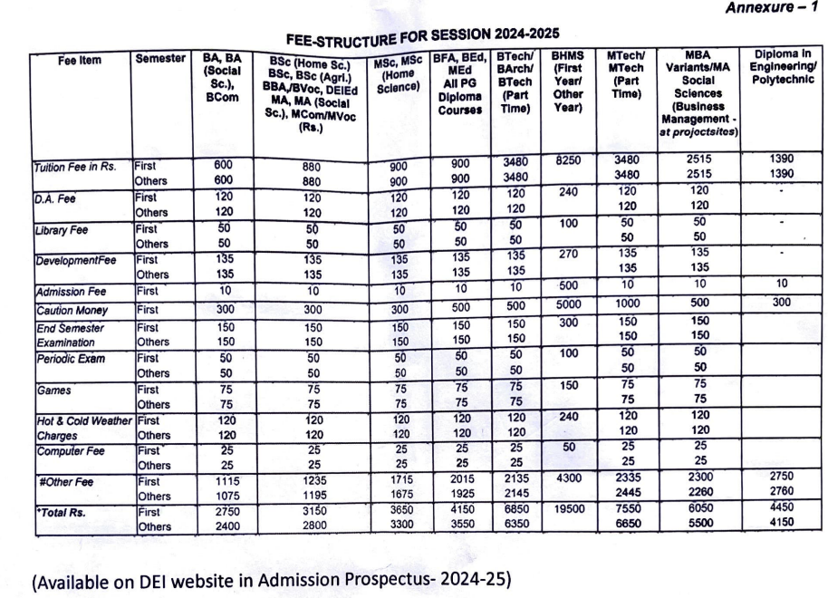 DEI MA Social Science is offered as 2 Years Full Time program. The minimum eligibility criteria for MA is Graduation+ CUET-PG. The total fees for DEI MA Social Science in 2025 is ₹ 11,550 for the complete course duration, which includes total tuition fees of ₹ 11,550. Earlier, the fees in 2024 - 2025 for MA Social Science was ₹ 11,500.