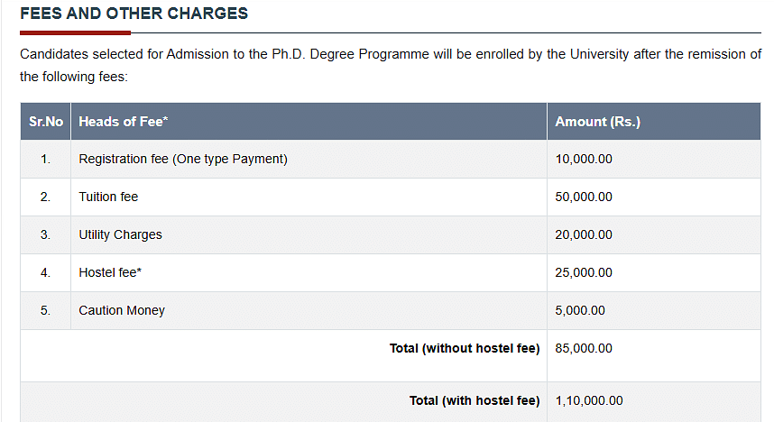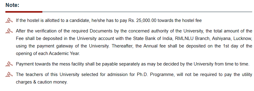 Earlier, Ph.D History fees at NLU Lucknow (RMLNLU) was ₹ 1.85 Lakhs (in 2024) for the entire course duration. This shows that the fee has remained unchanged since 2024.