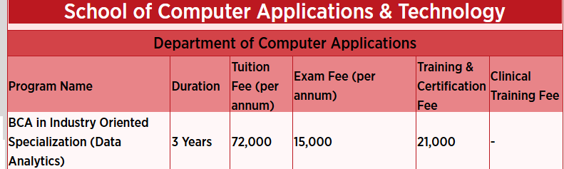 The highest salary package is 1.2 crore, with an average of 4 lakh, and around 70% of students secure jobs. The BCA in Data Analytics program costs Rs. 112,000 for the first year, including additional fees for specialization and registration, with the subsequent years costing Rs. 87,000 each. The university also offers various scholarships, such as merit-based and financial aid scholarships.