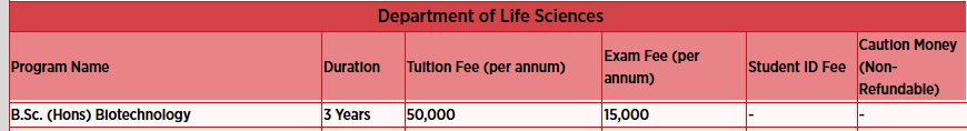 Biotechnology (3 years) and B.Sc. Biotechnology Research (4 years) costing 65,000 rupees annually, and B.Tech at 1,80,000 rupees per year. Additional charges include a 1,200 rupee registration fee and 15,000 rupees for exams. Merit-based scholarships offer tuition fee waivers: 50% for scores between 90-100%, 30% for 80-89.99%, and 10% for 60-69.99%. Class 12th students achieving 95% or above receive a 25% waiver, and those between 90-94.99% get 15%, except for B.Pharm and B.Sc Nursing.