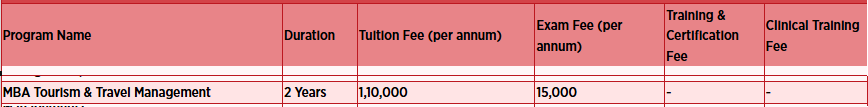 MBA Travel & Tourism at Galgotias University Greater Noida is a 2 Years Degree. The course is offered On Campus as a Full Time program. Galgotias University Greater Noida MBA Travel & Tourism First Year Fees is INR 1,33,000 for 2025.