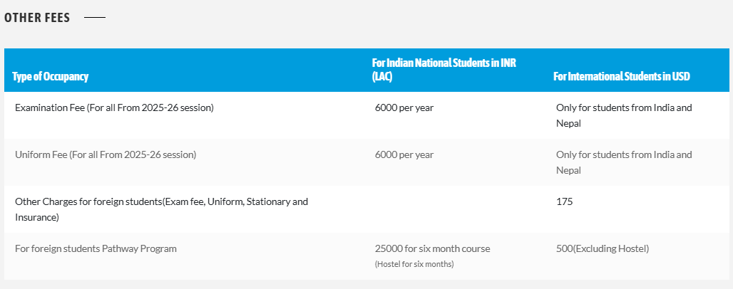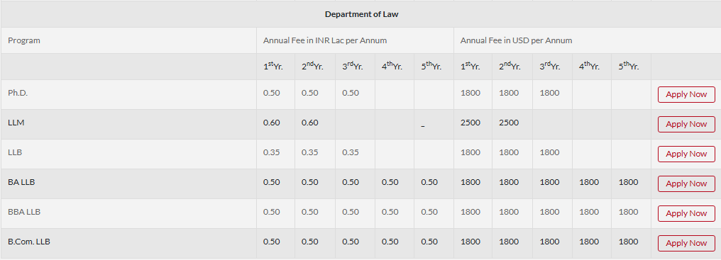The BALLB program costs Rs. 250,000 over five years, with an annual fee of Rs. 50,000. Additional costs include a one-time admission fee of Rs. 10,000 and yearly examination fees of Rs. 6,000. Registration fees are Rs. 750 for online and Rs. 700 for offline. Scholarships are available based on 12th-grade scores, with amounts ranging from Rs. 10,000 to Rs. 20,000 annually for students scoring above 80% and 90% respectively. However, there are no reservation provisions for SC/ST categories.
