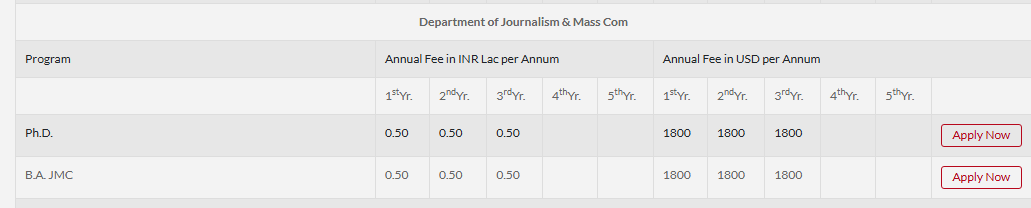 The program fee is Rs. 50,000 per year, payable in installments with concessions for financial difficulties. Students can participate in a six-month student exchange program abroad. The university facilitates placements, achieving an 80% rate before final exams, with notable companies like Google and Microsoft involved. The highest salary package is 10-12 LPA for MBA, while other programs see offers up to 6-7 LPA, with an average of 3 LPA. Journalism students face limited specific placement opportunities but benefit from internships at news agencies.