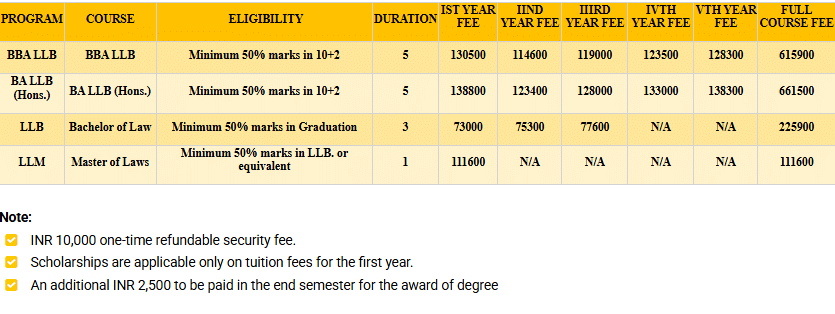 The university offers good placement opportunities, particularly in law, though internships require personal initiative despite support from the placement cell. Scholarships are varied, based on NIU SAT scores, sports, abilities, gender, and academic merit. Accredited with an A+ by NAAC, the university supports education loans through Punjab National Bank. The BBA+LLB program includes a semester fee of Rs. 45,000 and an annual charge of Rs. 90,000 for two semesters, along with a one-time security deposit of Rs. 10,000.