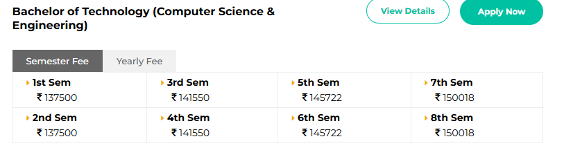 The table below displays the total fees for Sharda University BTech specialisations.