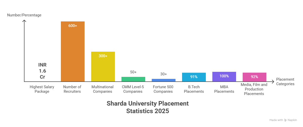 Sharda University concluded its 2023 placement drive. Sharda University's highest package stood at INR 40 LPA during the placement drive 2023. A total of 600+ recruiters participated in the Placement Drive 2023. During Sharda University School of Engineering Placements, reputed recruiters like Unacademy, Dominus Labs, InMobi Pvt Ltd, Ohreee Ltd, Karza Technologies, Matus Business Pvt Ltd, Zop Smart, etc visited the campus.