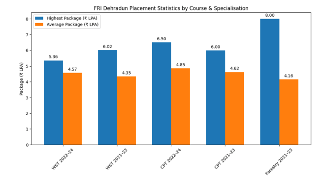 The placement statistics for the courses offered at the college vary significantly. The Wood Science and Technology course boasts a 100% placement rate, while the Cellulose and Paper Technology course also maintains a strong placement rate of over 80%. However, the Forestry and Environment Management courses have a lower placement rate at about 50-60%, with many students opting for further studies or civil services instead. The highest placement package offered is 10 lakh INR.