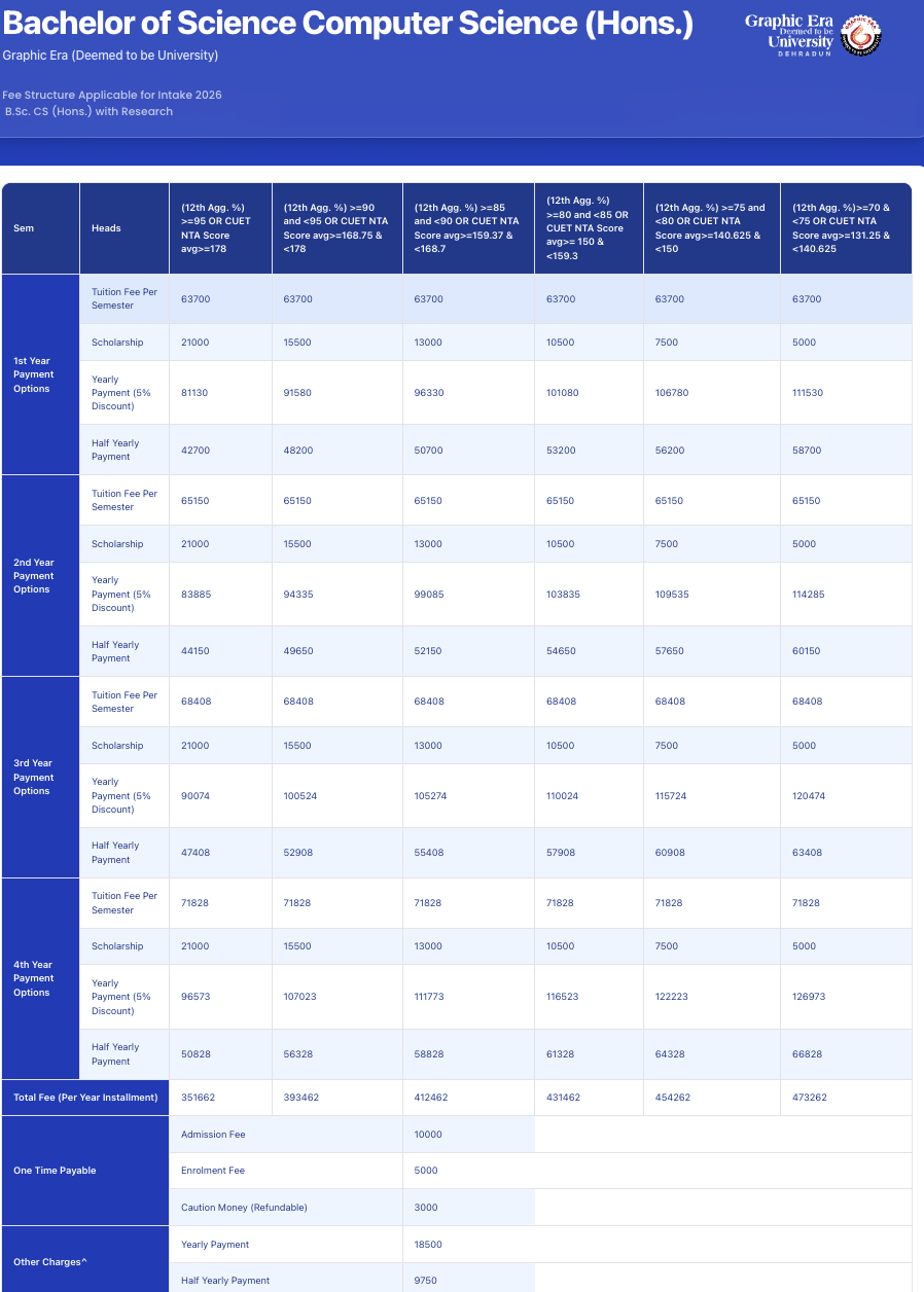 B.Sc {Hons.} Computer Science Fees at GEU covers a range of expenses, including tuition fee, course materials, and access to campus facilities.