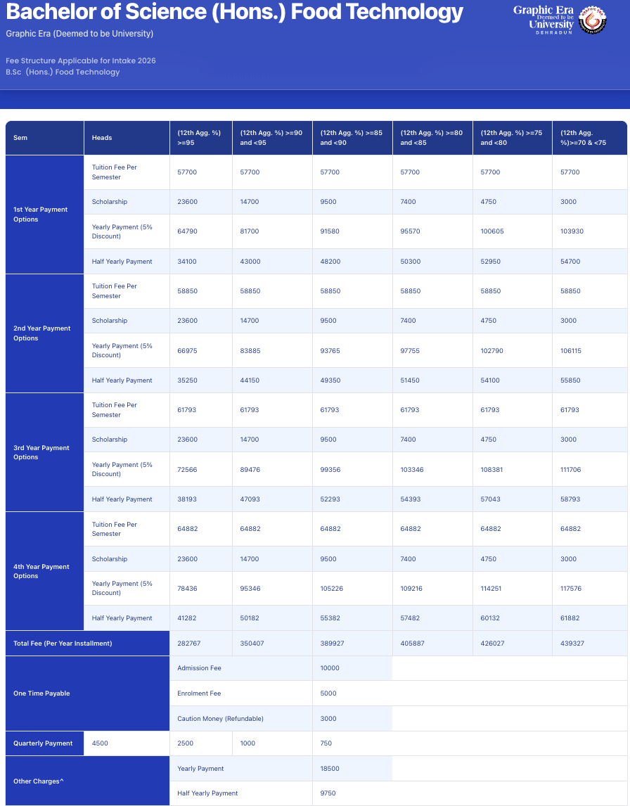 The average salary package for some courses stands at around 2.5 LPA. The college also encourages startups and offers internships with firms like Nestle. Scholarships are predominantly merit-based, available for students scoring above 80% in their 12th-grade exams and based on semester results. Female students and Uttarakhand residents receive a 10% discount. Achieving over 90% in semester exams grants an additional 5000 rupees off. Education loans are available, and scholarships are tiered, with specific criteria for scores between 75-80% and 80-85%.
