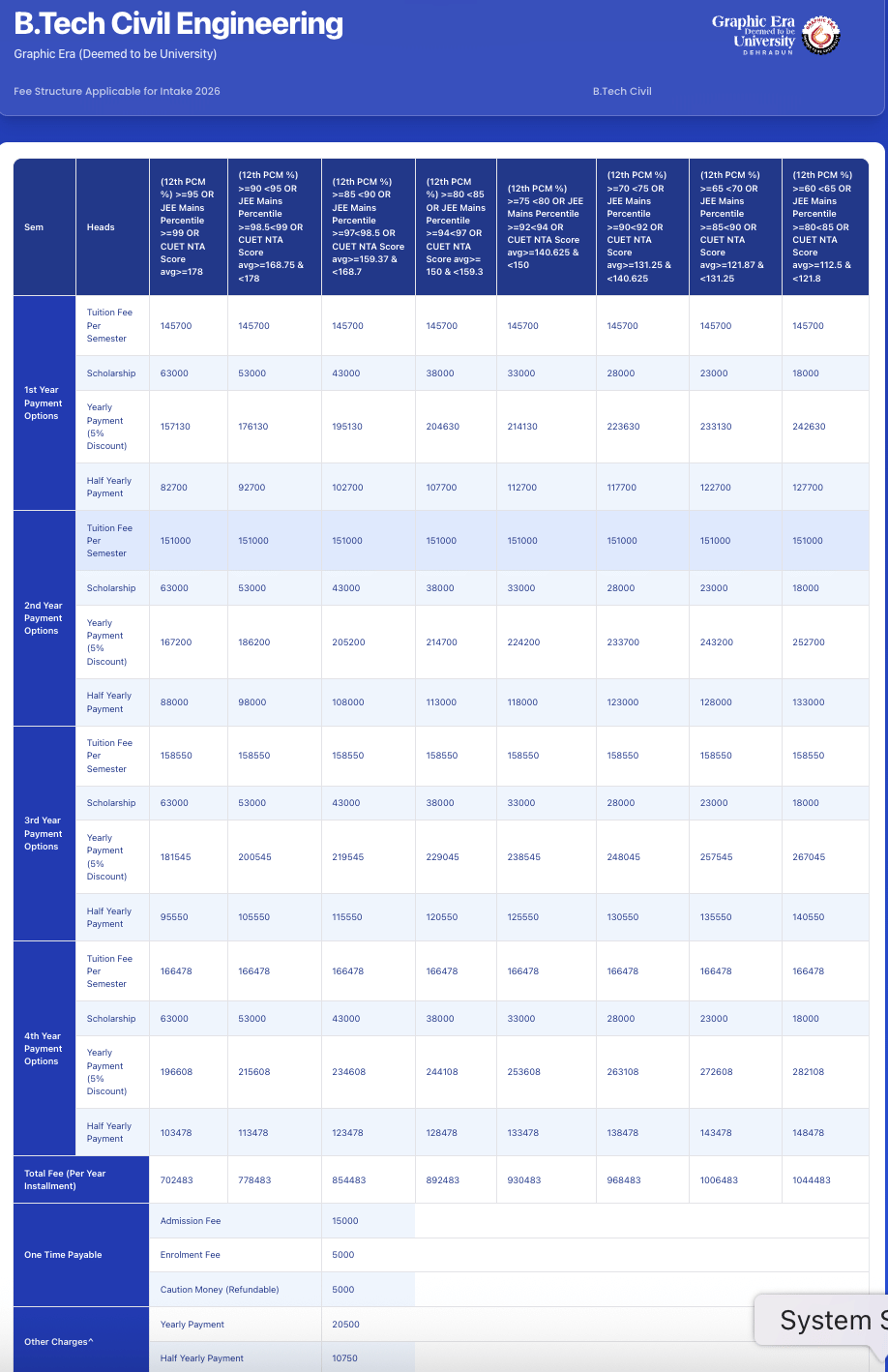 Graphic Era University offers a straightforward admission process without the need for an entrance exam. Prospective students must provide essential documents like 10th and 12th-grade report cards, photographs, Aadhar card, and a fees cheque. Additional documents such as a transfer and character certificate may also be required. The university's civil department boasts a highly qualified faculty, all holding Ph.D. degrees and at least 20 years of teaching experience, graduated from top colleges in India.