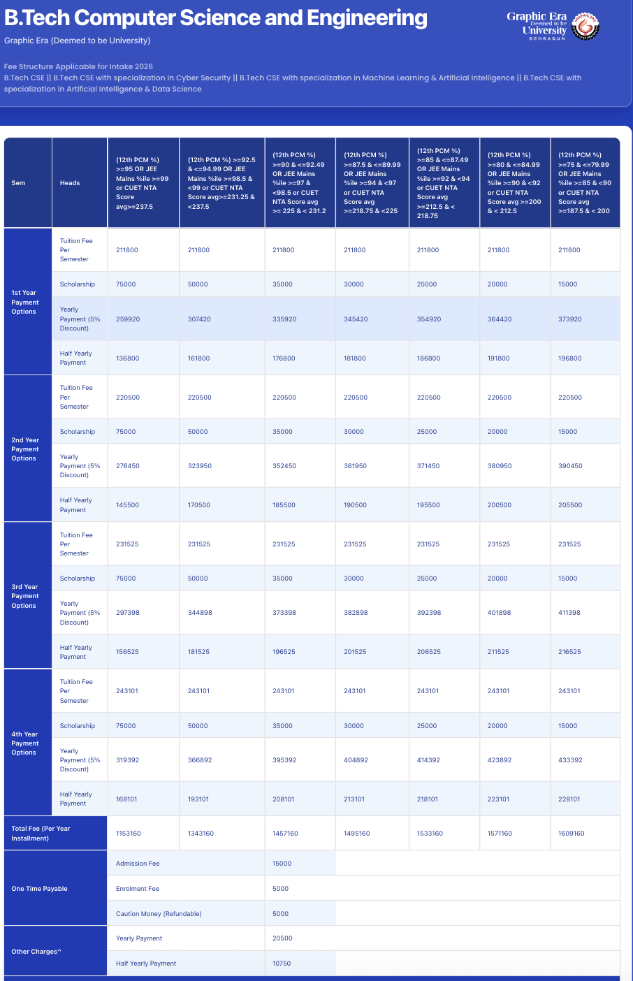 Fees at Graphic Era University for the Bachelor of Technology (B.Tech) in Computer Science and Engineering program ranges from INR 13 to 14 lakhs for the entire four-year duration. The fee includes various components such as tuition, examination, and other service charges. The semester fee is typically about INR 1.5 to 2.5 lakhs. Students may face annual fee hikes ranging from 5% to 10%. For accommodation, the hostel fees add approximately INR 1 to 1.45 lakhs annually, depending on the room type and facilities.
