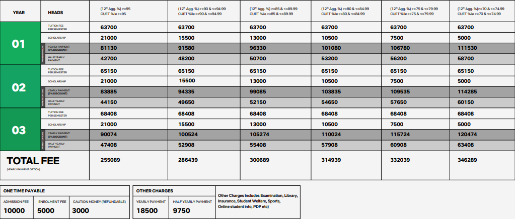 Additionally, children of army personnel and top-performing students can benefit from fee concessions. Female students receive an upfront 10% discount, with additional scholarships for those who excel academically. Students scoring 80% or more are eligible for a fee waiver ranging from 10-20% per semester. The overall fee structure is competitive compared to other private universities.