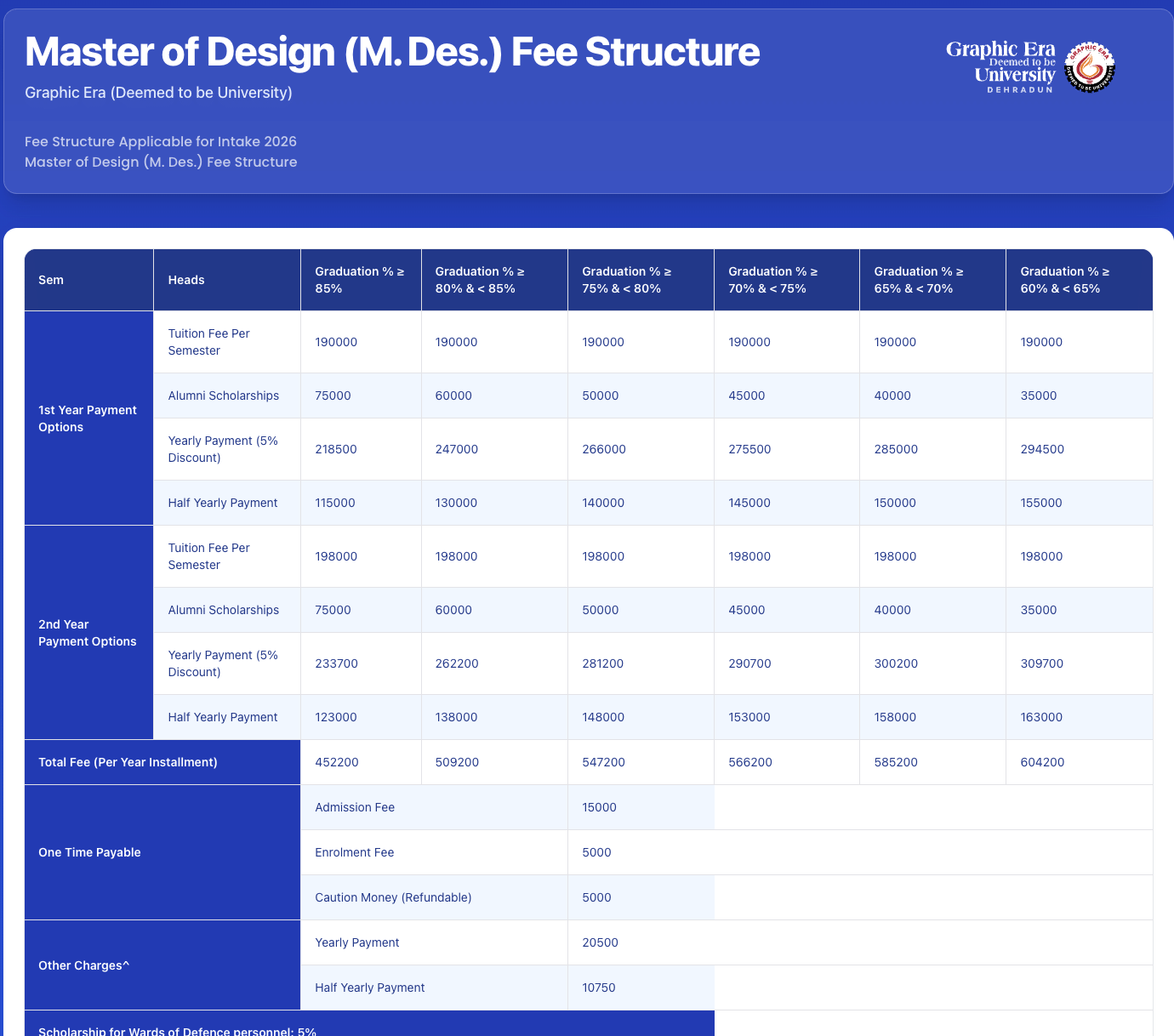 - The total fees for M.Des is ₹ 8.22 Lakhs.