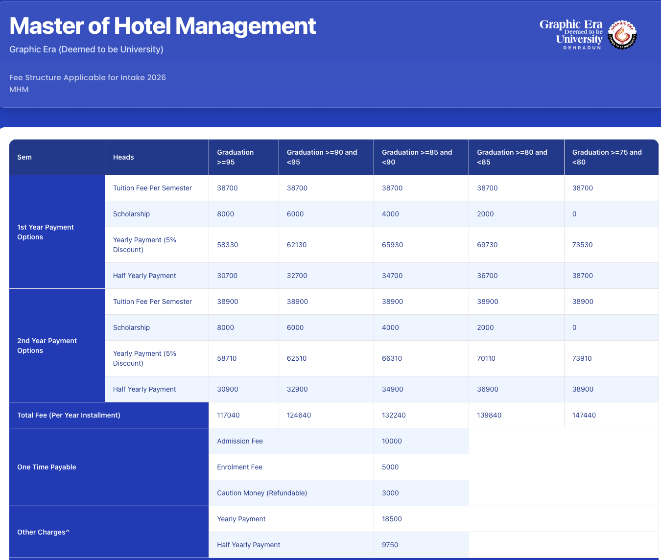 Earlier, MHM fees at GEU was ₹ 1.76 Lakhs (in 2021) for the entire course duration. This shows a fee increase of ₹ 15,350 over the year.