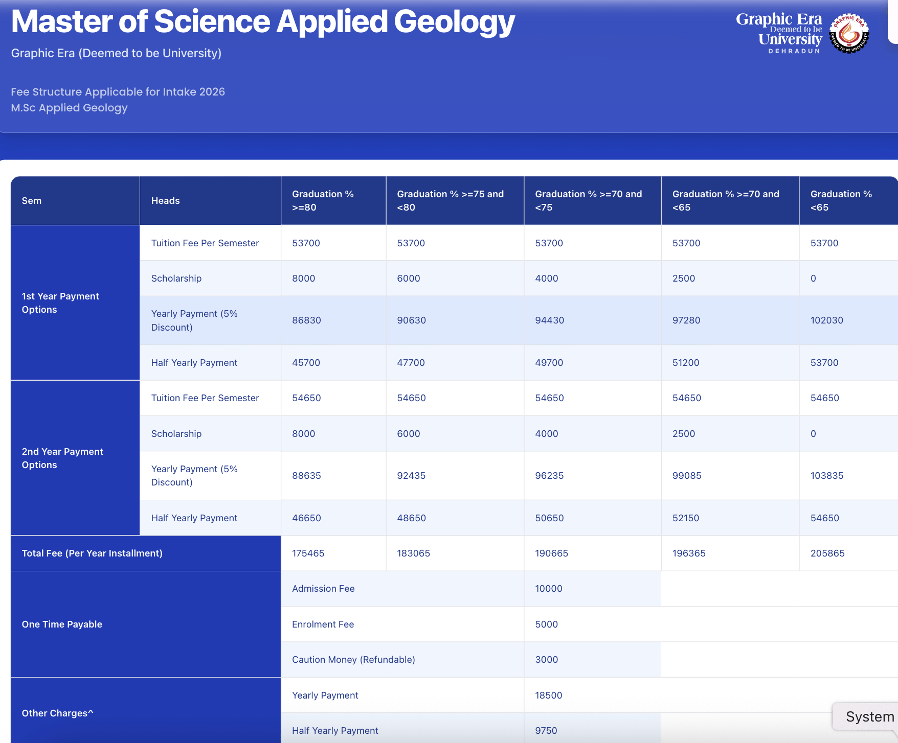 Earlier, M.Sc Applied Geology fees at GEU was ₹ 2.53 Lakhs (in 2025) for the entire course duration. This shows that the fee has remained unchanged since 2025.