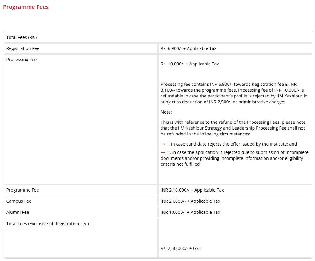 Earlier, Executive Certificat Strategy & Leadership fees at IIM Kashipur was ₹ 2.5 Lakhs (in 2024) for the entire course duration. This shows that the fee has remained unchanged since 2024.