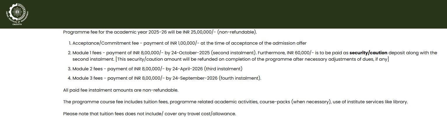 IIM Calcutta Ph.D Executive fees 2025 is ₹ 25 Lakhs for the entire course duration.