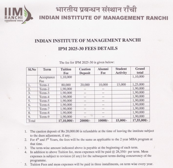 - IIM Ranchi Hostel Fee is ₹ 1.2 Lakhs.