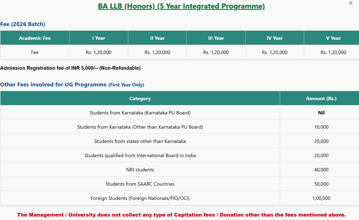 Yearly fees for some programs are Rs 70,000 initially, increasing to Rs 90,000 later, totaling approximately Rs 360,000, excluding exam fees. The college offers a safe, supportive environment with competitive fees compared to other private law colleges in Bangalore.