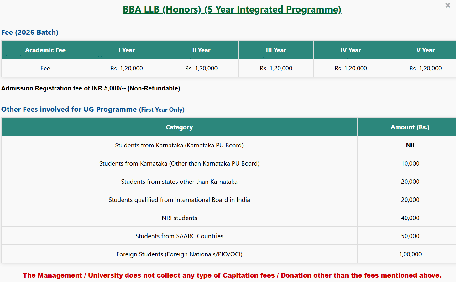 The total tuition fee over five years is 360,000, with the first two years costing 60,000 each and the following three years at 80,000 annually. Additional fees include a 5,000 Law Registration fee, a 35,000 LLB Additional fee, and other fees totaling 59,000, leading to a total yearly cost of 850,000. Scholarships based on merit, talent, and financial need are available, though specifics are not detailed. There are no on-campus job opportunities, but students often find external work.