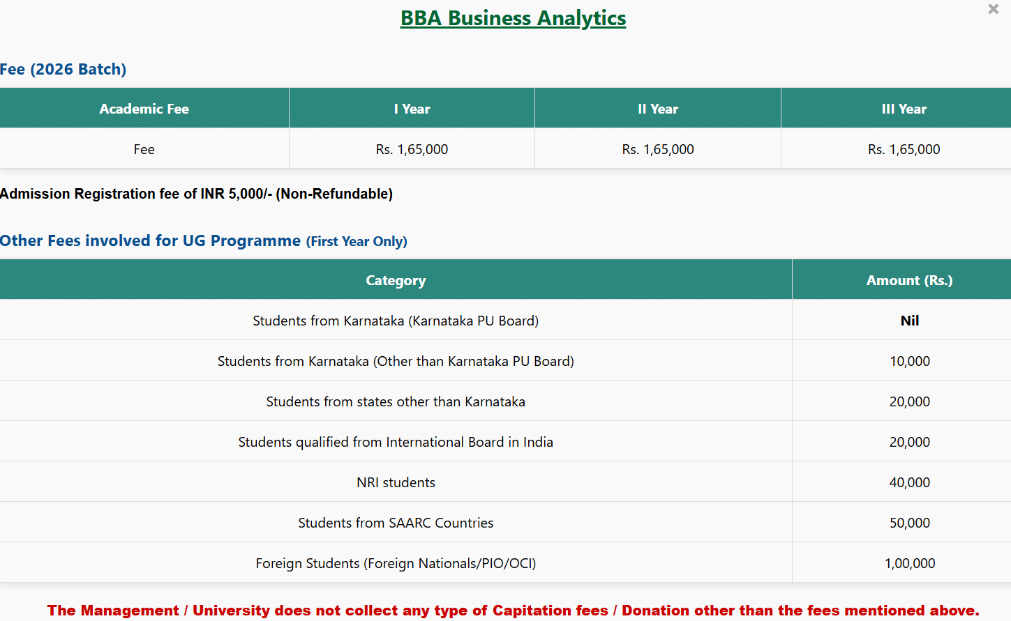 Admission to Kristu Jayanti College involves an online application, followed by an interview and counseling session to assess candidates' decision-making skills. Non-commerce stream applicants must take an accountancy test. With a student-to-mentor ratio of 1:20, the faculty, comprising around 2,000 members, is known for being supportive. The BBA Business Analytics course costs 70,000 INR, with an additional 20,000 INR for NRI students. An examination fee of 1,500 INR is required before mid-terms.