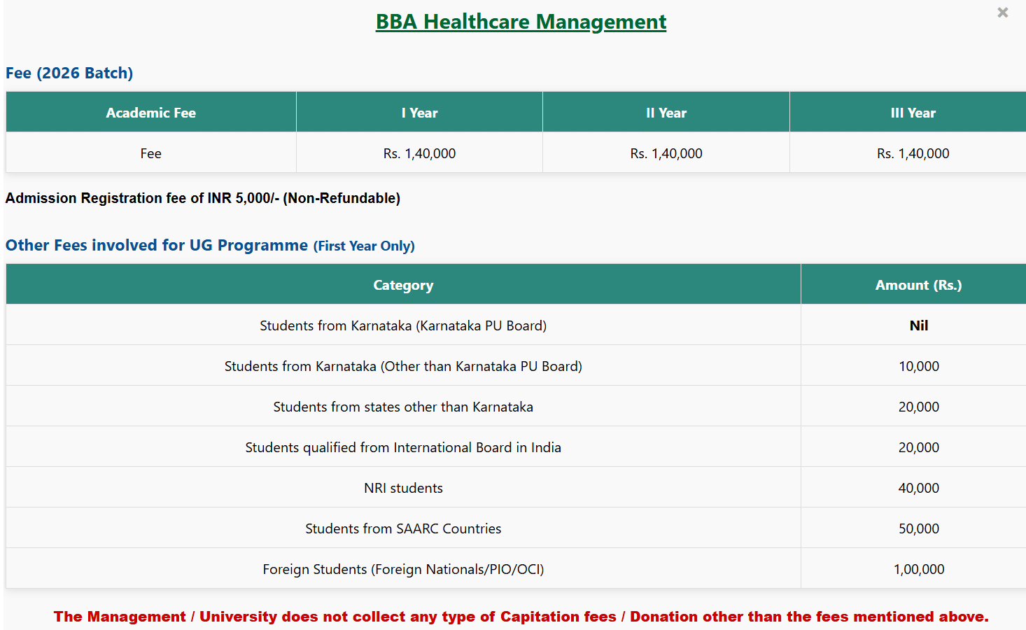 Earlier, BBA Healthcare Management fees at Kristu Jayanti University was ₹ 3.9 Lakhs (in 2025) for the entire course duration. This shows a fee increase of ₹ 35,000 over the year.