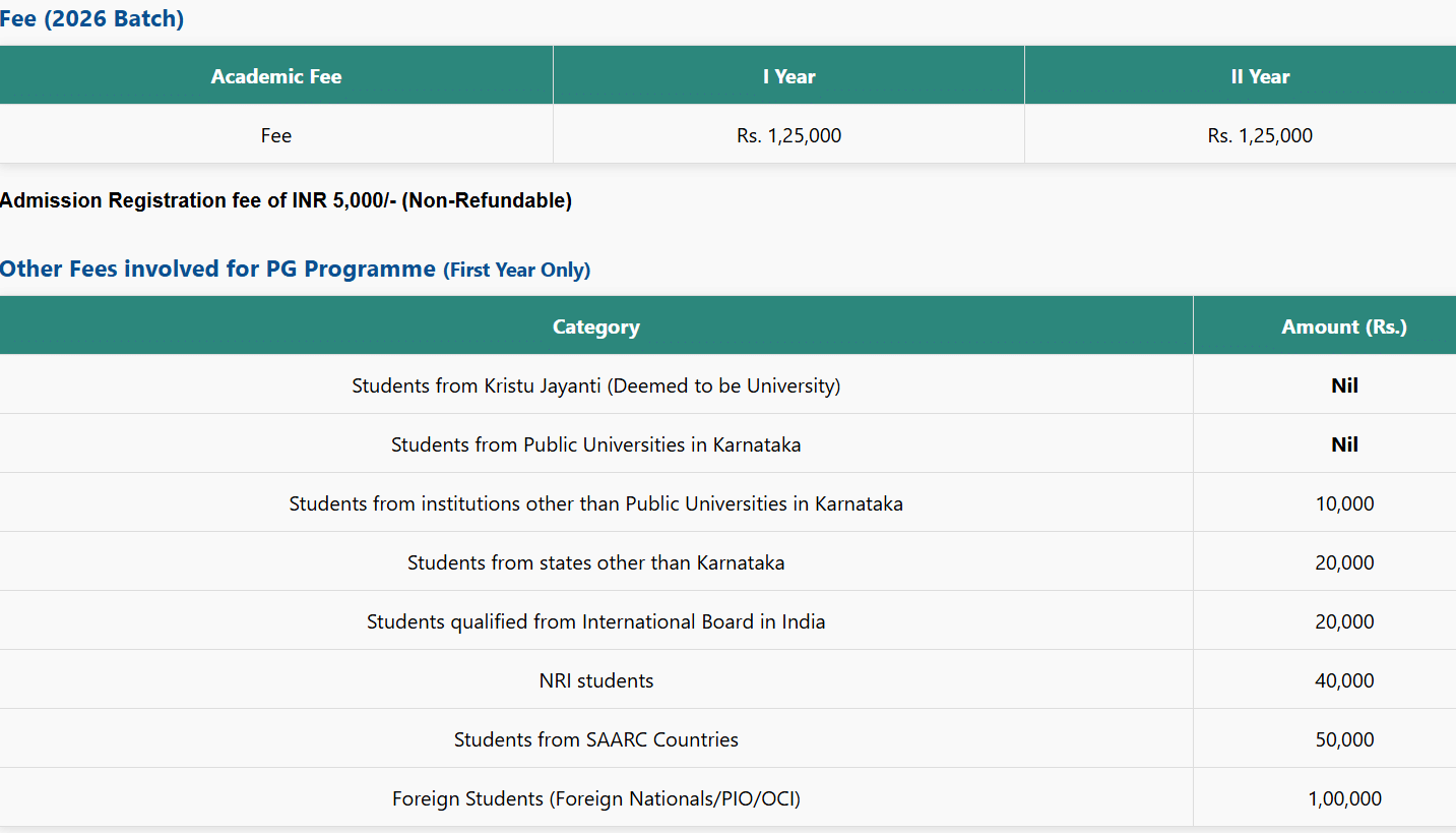 Earlier, M.Sc Bioinformatics fees at Kristu Jayanti University was ₹ 1.4 Lakhs (in 2025) for the entire course duration. This shows a fee increase of ₹ 1.15 Lakhs over the year.