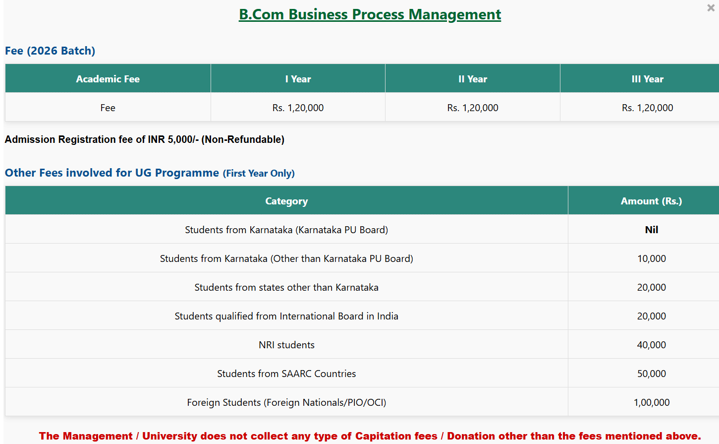 Earlier, B.Com Business Process Management fees at Kristu Jayanti University was ₹ 3.3 Lakhs (in 2025) for the entire course duration. This shows a fee increase of ₹ 35,000 over the year.