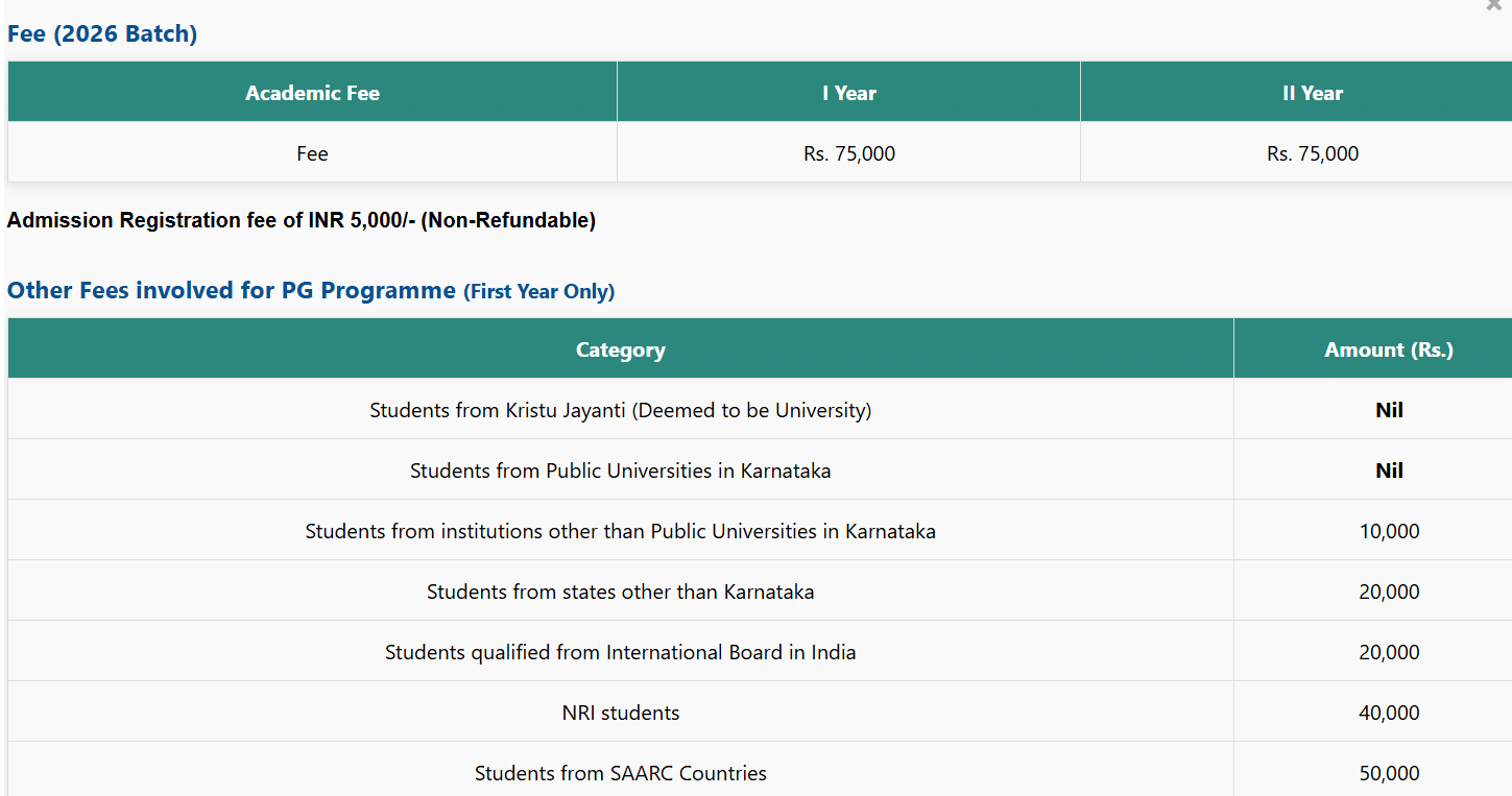 Earlier, MA English Literature fees at Kristu Jayanti University was ₹ 1.7 Lakhs (in 2025) for the entire course duration. This shows a fee decrease of ₹ 15,000 over the year.