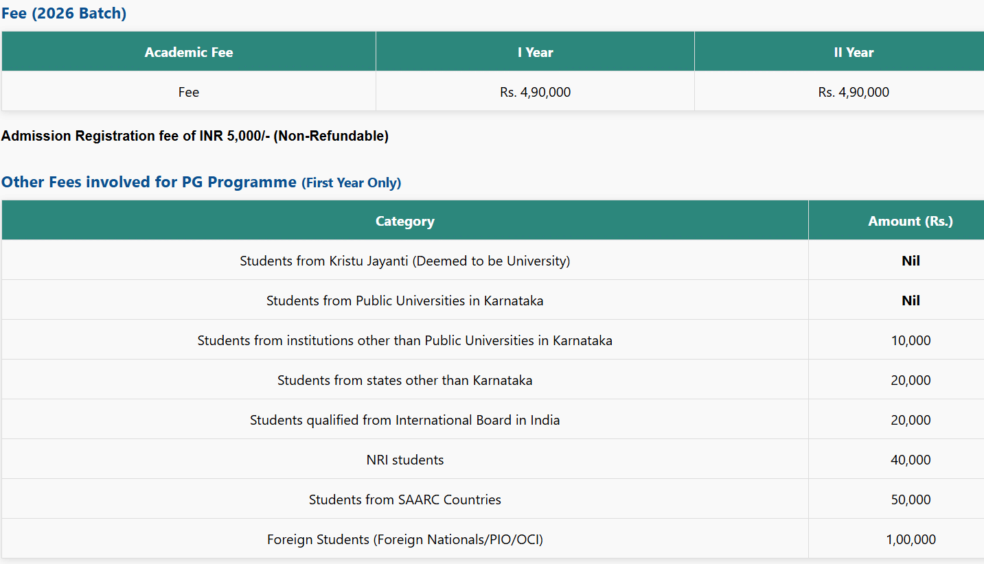 Earlier, MBA International Finance fees at Kristu Jayanti University was ₹ 9.65 Lakhs (in 2025) for the entire course duration. This shows a fee increase of ₹ 20,000 over the year.