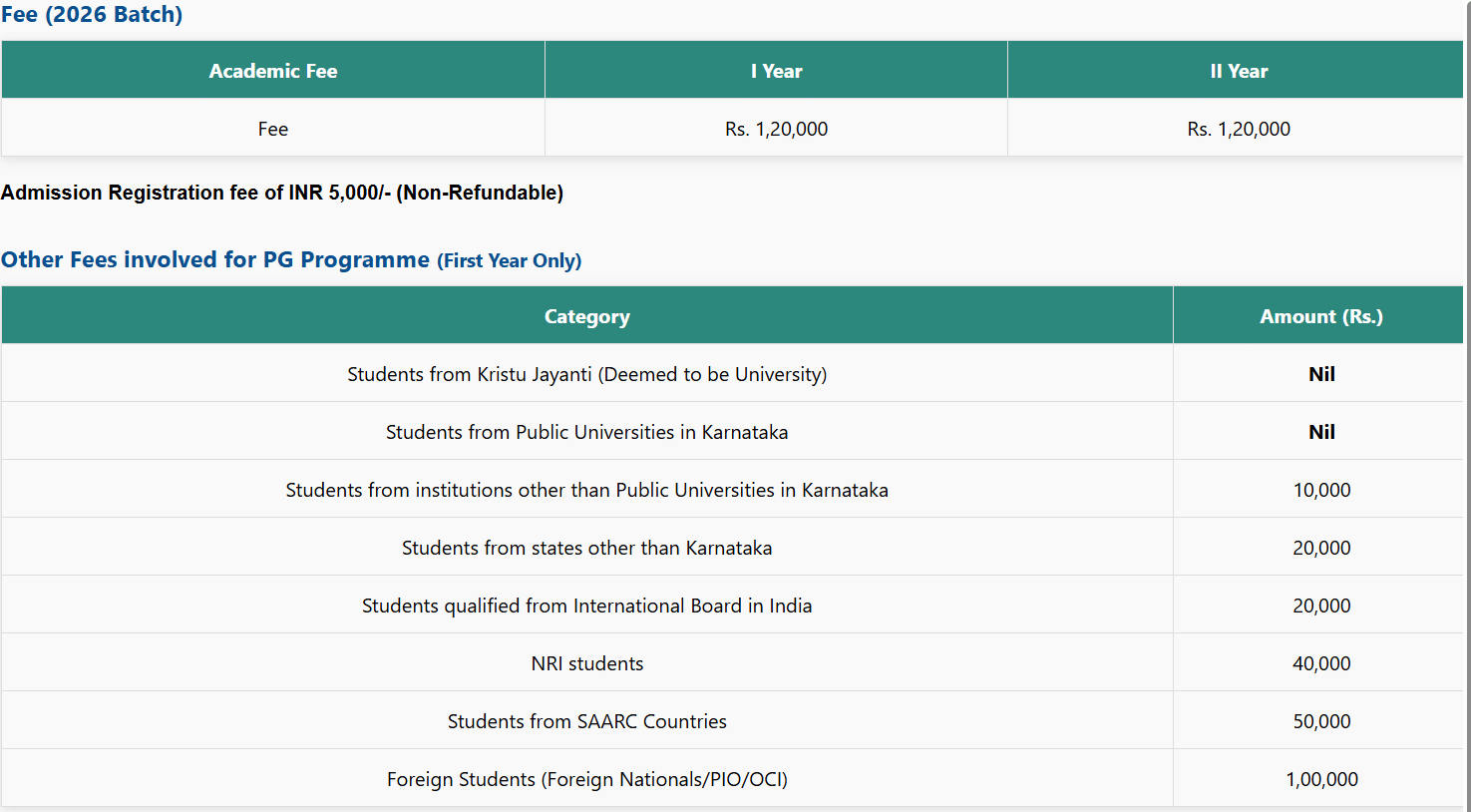 Earlier, M.Sc Counselling Psychology fees at Kristu Jayanti University was ₹ 2.3 Lakhs (in 2025) for the entire course duration. This shows a fee increase of ₹ 15,000 over the year.