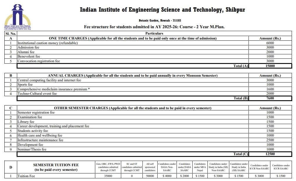 IIEST Shibpur M.Plan Urban And Regional Planning fees in first year is ₹ 70,100. The detailed fees is mentioned below.