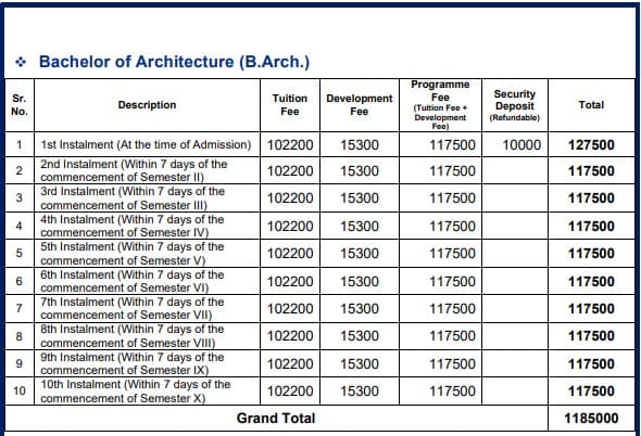 - The total fees for B.Arch is ₹ 11.85 Lakhs.