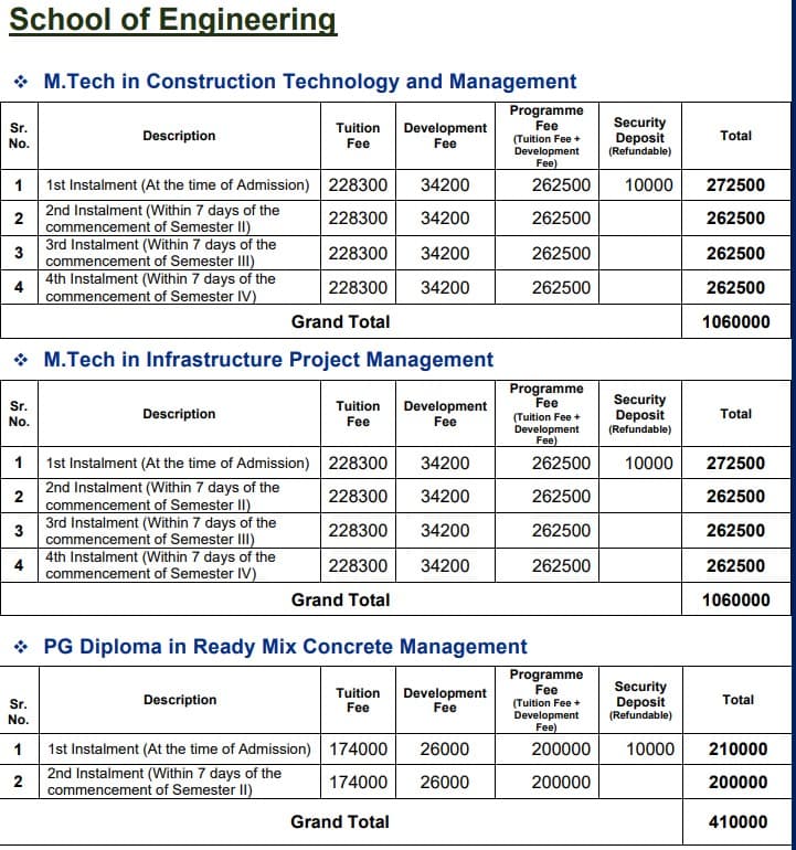 Earlier, M.Tech Constructions Technology & Management fees at NICMAR Pune was ₹ 10.6 Lakhs (in 2025) for the entire course duration. This shows that the fee has remained unchanged since 2025.