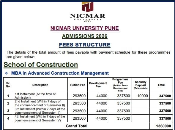 Earlier, MBA Construction Management fees at NICMAR Pune was ₹ 10.6 Lakhs (in 2025) for the entire course duration. This shows that the fee has remained unchanged since 2025.