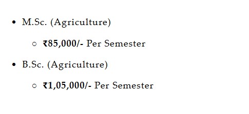 The BSc (Hons) Agriculture program spans 4 years with an annual fee of Rs. 1,80,000. MSc programs, including Agronomy, Horticulture, Entomology, Pathology, Seed Science, and Breeding, are 2-year courses. Hostel fees are Rs. 50,000, and mess fees are Rs. 48,000 annually. A newly established placement department helps students secure opportunities across various companies, enhancing their career prospects.