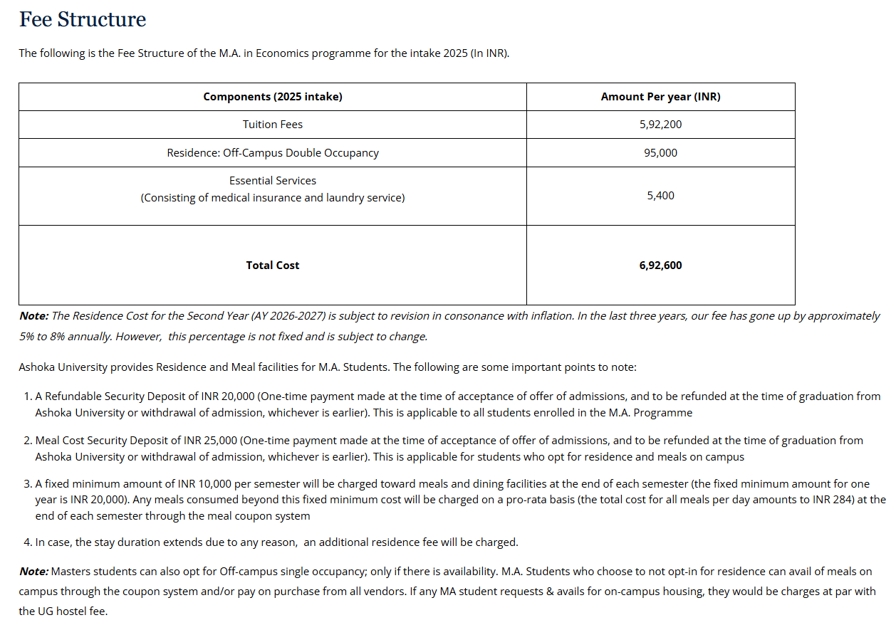 Earlier, MA Economics fees at Ashoka University was ₹ 11.39 Lakhs (in 2025) for the entire course duration. This shows a fee increase of ₹ 2.66 Lakhs over the year.