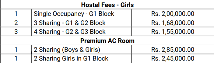 The hostel at REVA University offers various room-sharing options, including single, three, and four-sharing accommodations. The annual fee for a single room is Rs. 1,38,000, for three-sharing Rs. 1,18,000 to Rs. 1,67,000, and for four-sharing Rs. 1,00,000 to Rs. 1,54,000. Rooms are equipped with basic furniture and include attached bathrooms.