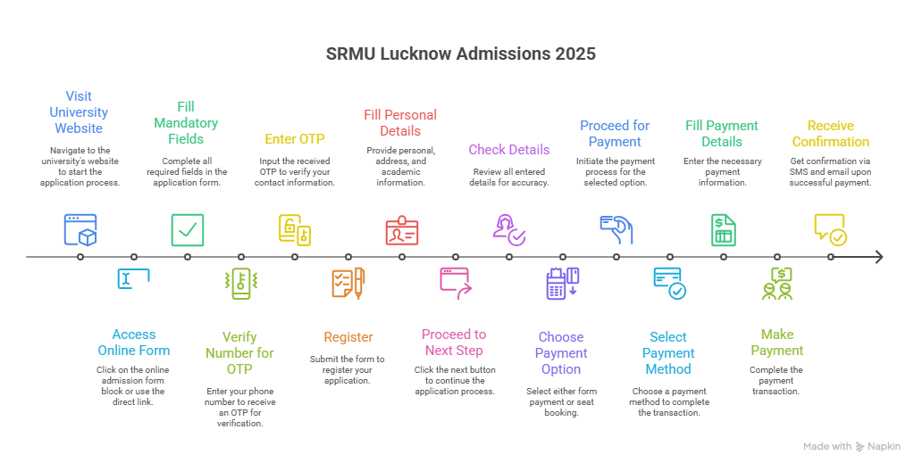 SRMU is inviting applications for UG/PG Admission 2025. Candidates seeking admission to SRMU Lucknow need to simply apply on the official website. The application mode is online and candidates can also visit the campus for the offline admission process. Candidates need to submit the application form with all the necessary details along with the application fee of INR 500 for Polytechnic and INR 1,000 for other courses.
