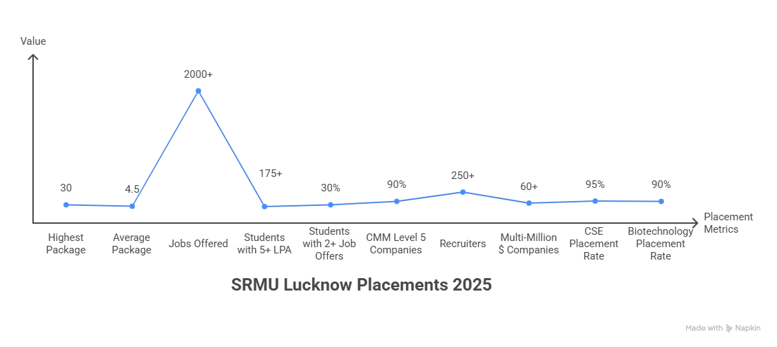 SRMU Lucknow Placement Report 2025 has been released. The university witnessed more than 2000 jobs being offered to eligible students. SRMU Lucknow highest package was offered at INR 30 LPA by Morgan Stanley, while SRMU Lucknow average package was recorded at INR 4.5 LPA. The university saw 250+ recruiters participating in the drive. 1000+ students were placed in Fortune 500 companies, with 90% students being placed in CMM Level 5 companies. Leading recruiters here include Accenture, TATA Consultancy Services, Axis Bank, Jaro Education, Internshala, and Bluestone Jewellery.