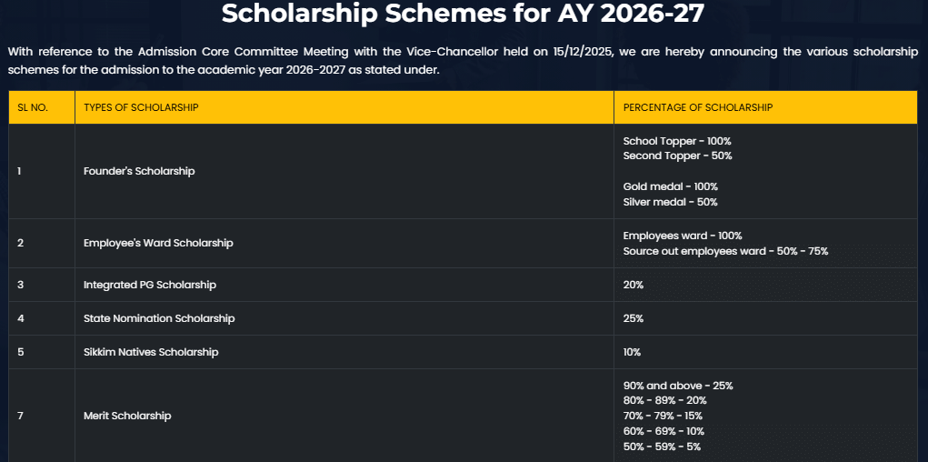 Other scholarships include the Employee Ward and Sikkim Native Scholarships. Admissions are held in three phases, with fees rising in each phase.