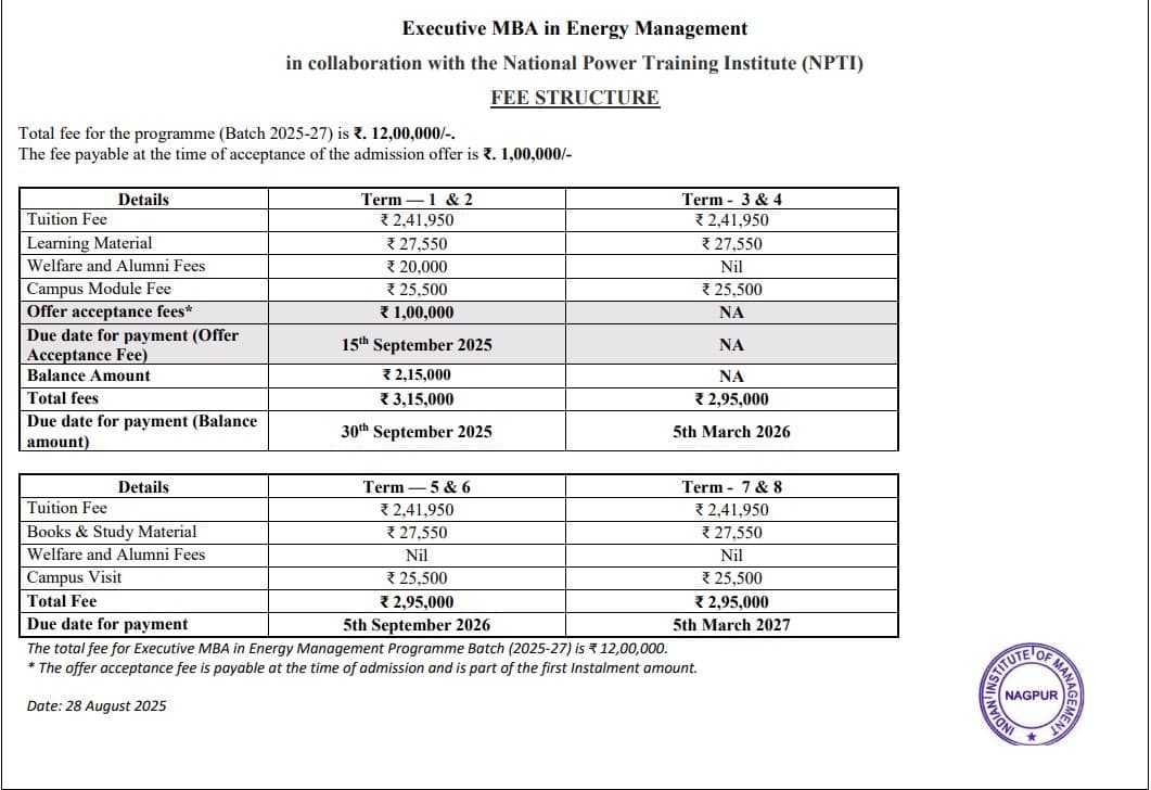 Earlier, MBA Energy Management fees at IIM Nagpur was ₹ 18.9 Lakhs (in 2024) for the entire course duration. This shows a fee decrease of ₹ 6.9 Lakhs over the year.